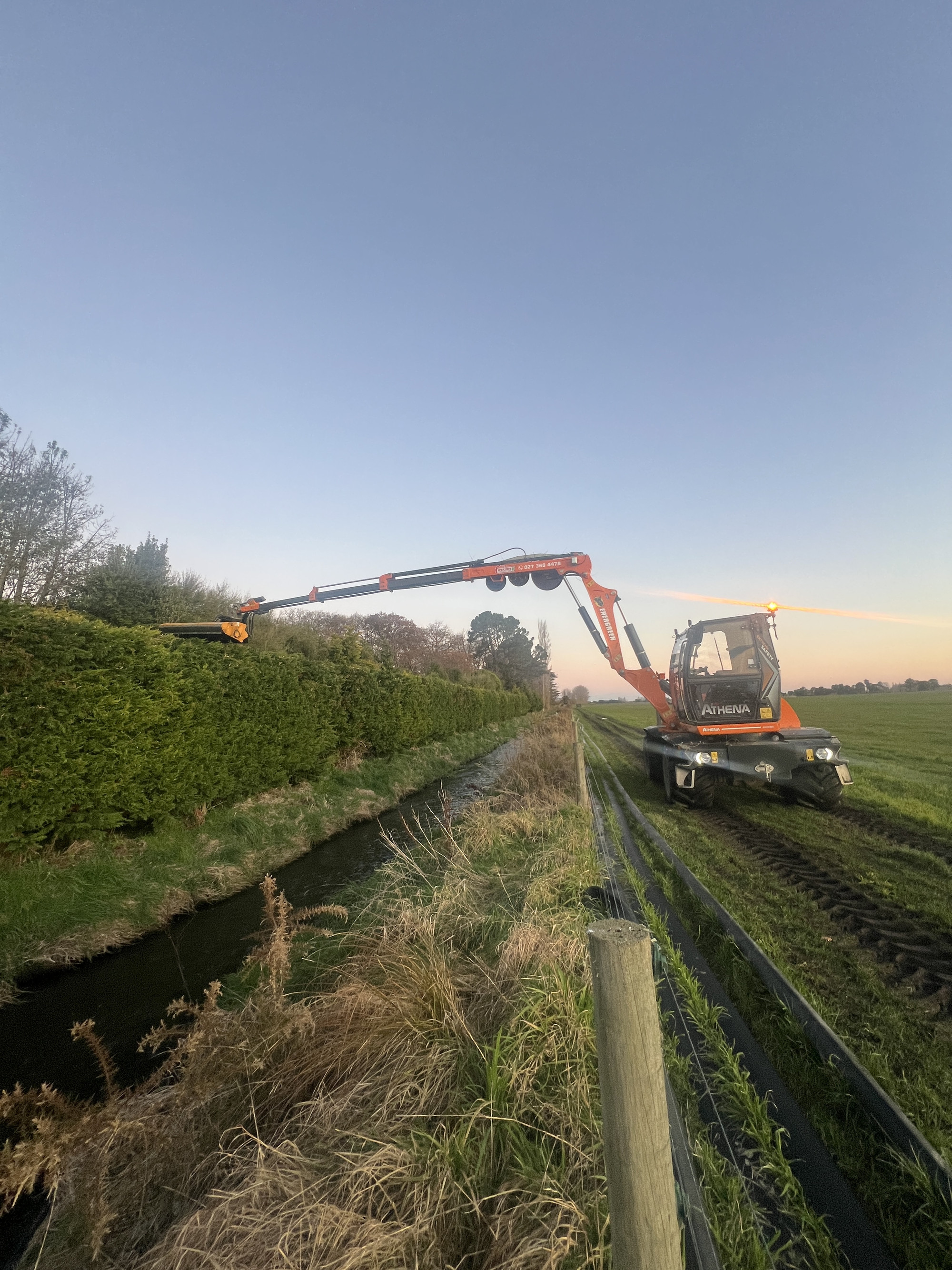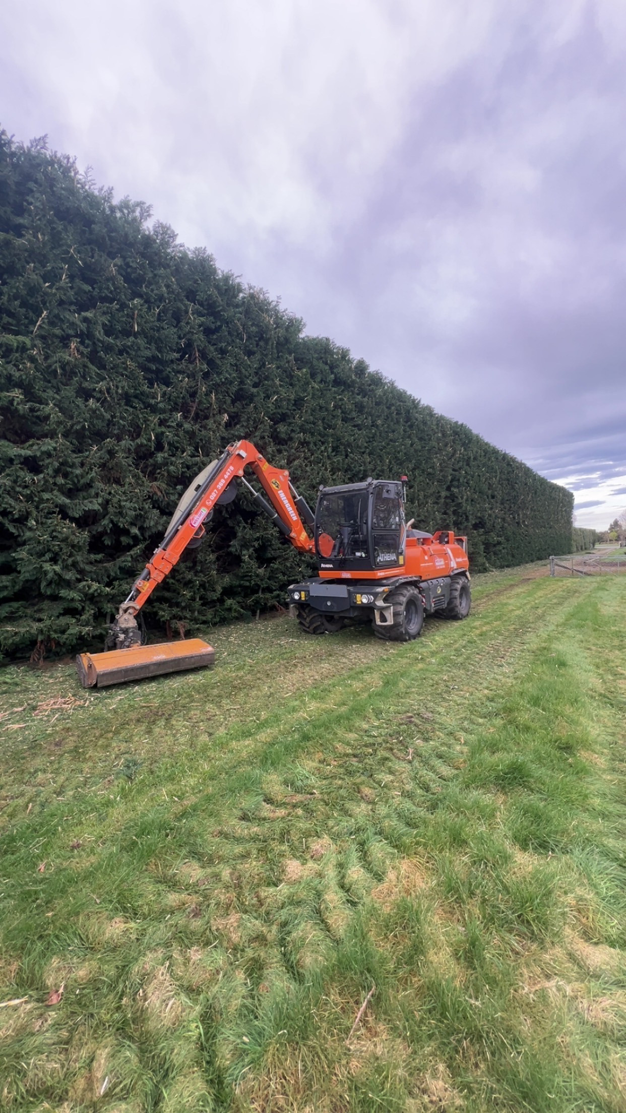 We operate two McConnel Tele-VFR 8-metre reach flail hedge cutters, each fitted with a heavy-duty, mess-free mulcher head and an adapted saw blade and slasher designed to tackle even the toughest hedges. Whether it’s shelterbelts, lifestyle block boundaries, or roadside trimming, we ensure a clean, even cut and minimal disruption