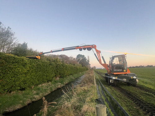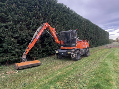 We’ve also expanded our fleet with saw blades, a rotary head, and a new tree shear/topper capable of cutting through trunks up to 400 mm thick. The shear grab with an integrated blade allows us to safely lower hedge heights or remove small trees — leaving a clean, professional result every time.